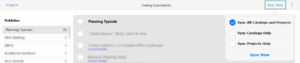 - From the Catalog Subscription Screen, tap on Sync Now and allow KITS to run a complete sync. Sync time will vary depending on the date of your last successful sync and depending on which syncing option you chose. You can also sync projects from the Manage Project Screen.