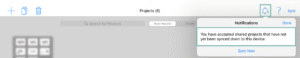 - Open KITS on your iPad and tap Sync from the Project Gallery screen. You will also notice your Notification Bell will show an alert that ‘You have accepted shared projects that have not been synced down to this device’. You can also tap on Sync Now from your Notifications drop down message to complete this step