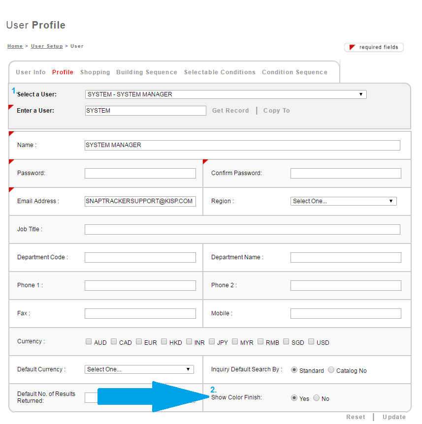 1. From the Select a User drop-down selection box, select the User that typically wants to see the Color Finish column in the results page.