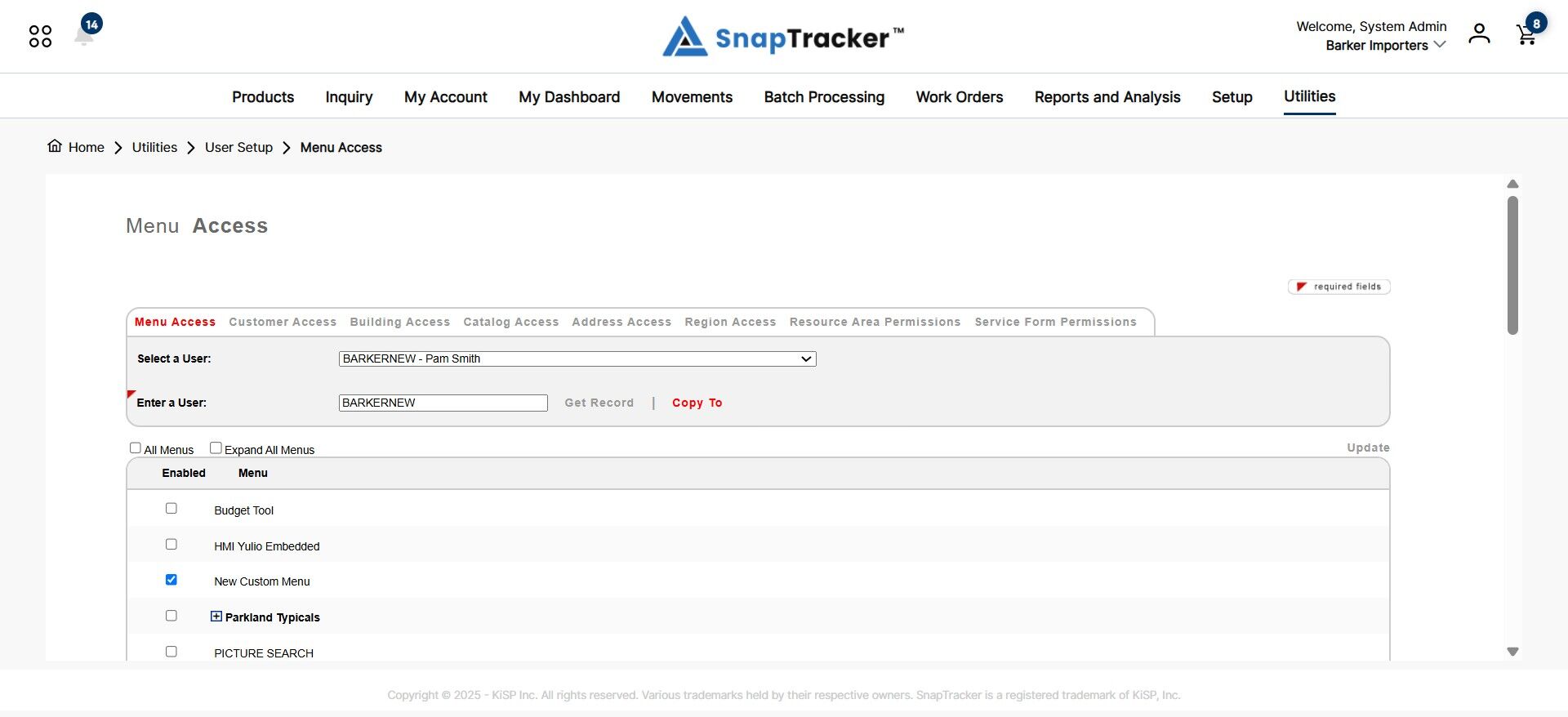 User settings or access are assigned individually per user. They may also be copied over to another user to quickly grant a standardized set of user access settings, such as Menu Access, Customer Access, Building Access, Catalog Access, etc. User settings may also be mass copied to all Users in your SnapTracker site.