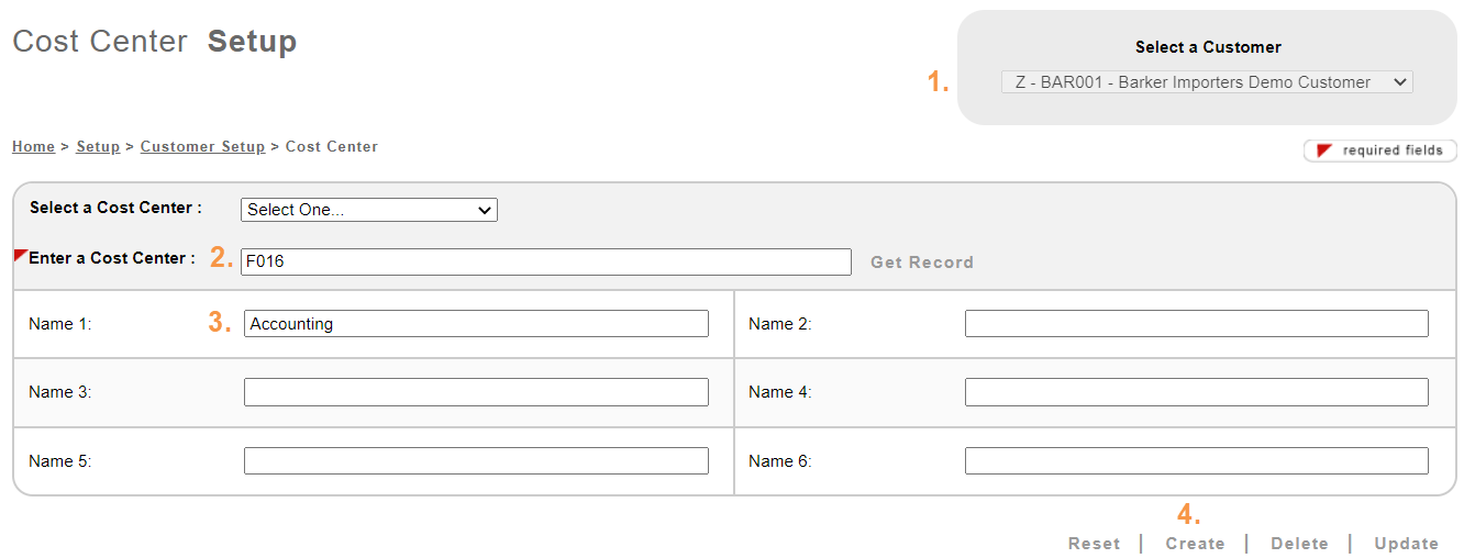 - In the Enter a Cost Center text box, type in the Cost Center code for the Customer. The character limit is 50 characters.