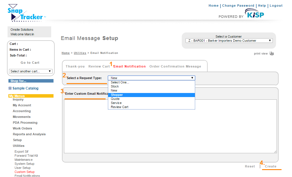 First, select the Customer Number for whom you would like to Custom Email Notification Messages.