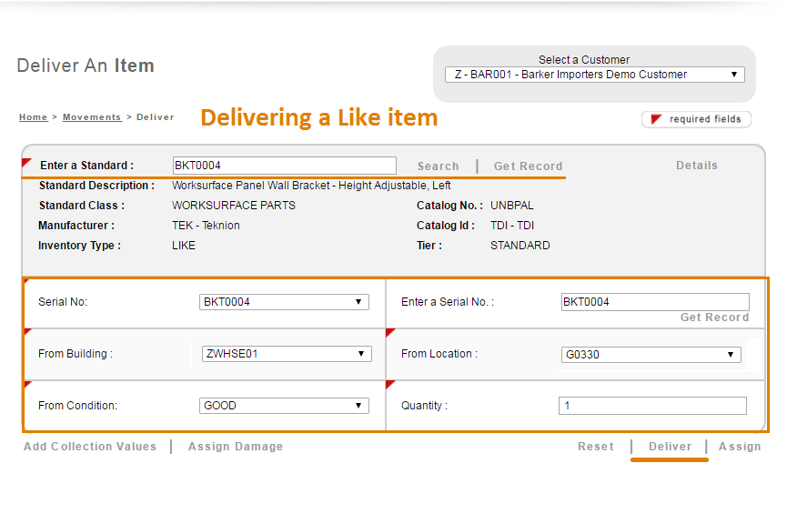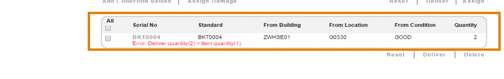 If the Inventory Type of the selected Standard is Like, the Standard is automatically populated in the Serial No. field. You will then need to select the Building, Location and Condition of the Like item(s) you wish to deliver using the drop-down selection boxes.