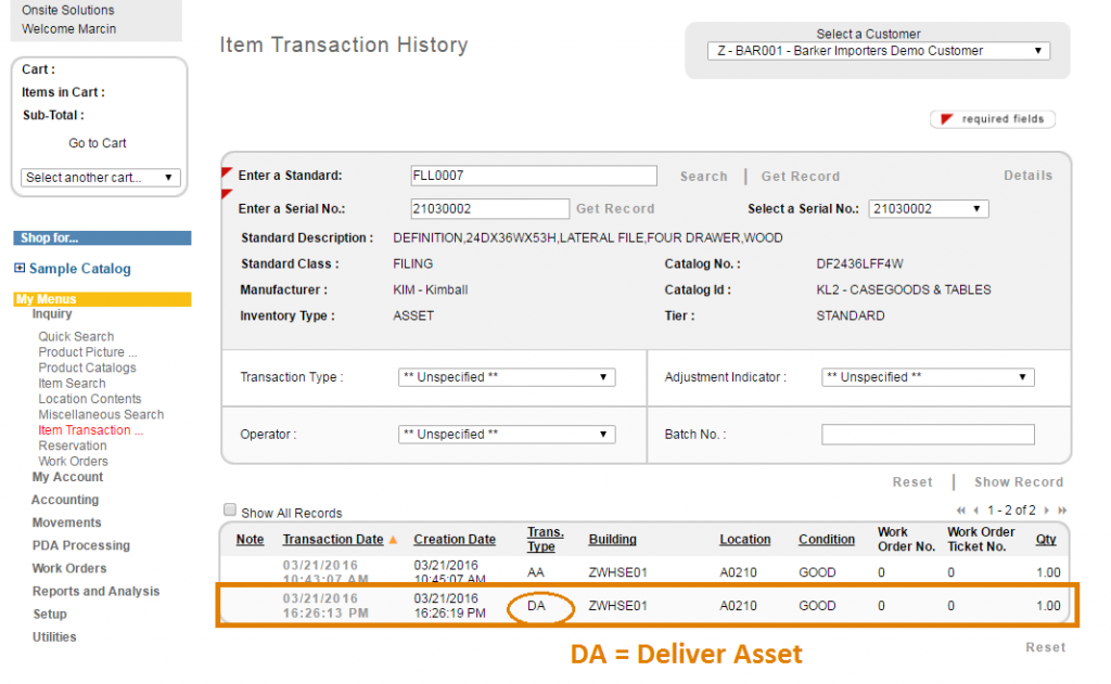 After an Asset item is delivered, its transaction history remains in the SnapTracker and is tracked by its serial number. You can access the Item Transaction History of the product on the Item Transaction History screen.