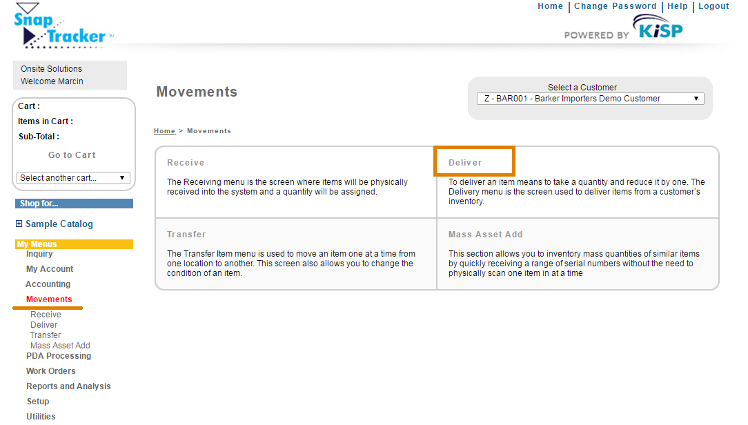 The Movements screen displays. Select Deliver.