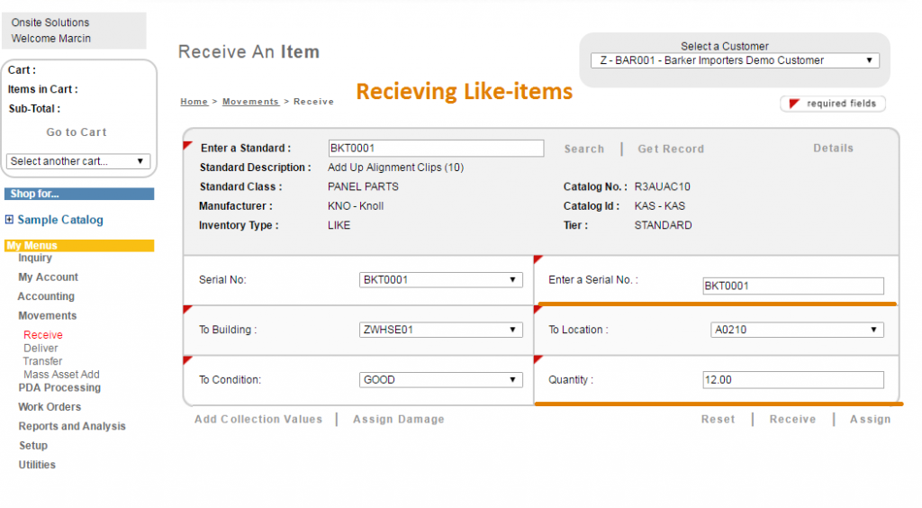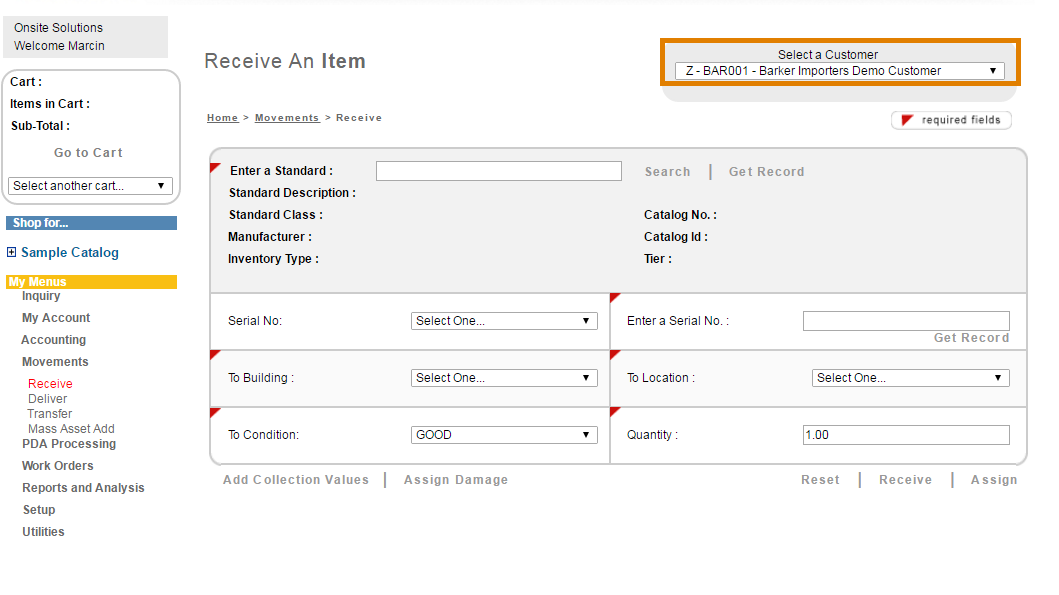 Make sure the correct Customer Number displays in the top right corner by answering “whose inventory am I receiving”. You can use the Select a Customer drop-down box to choose the correct Customer.