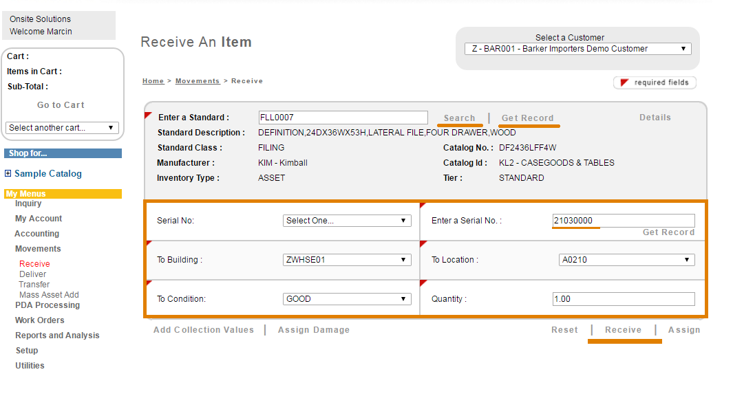 To receive an Asset item, first select the Standard of the Asset using the Enter a Standard box. If you are typing in the Standard (instead of performing a Product Search), remember to click Get Record.