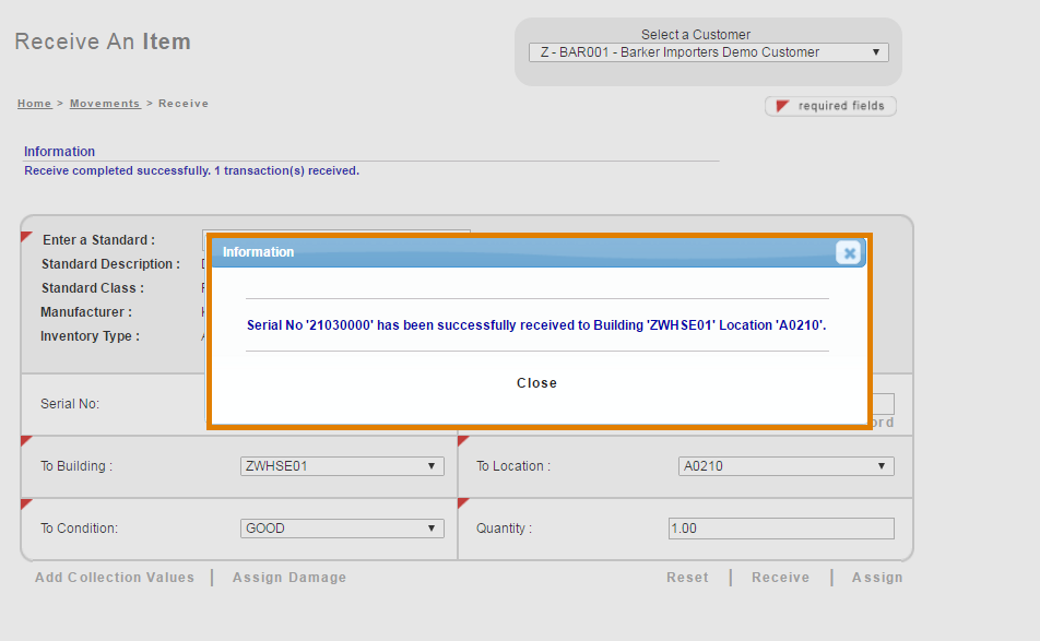 Click Receive at the bottom of the page. A pop-up screen displays, indicating the Asset item has been successfully received.