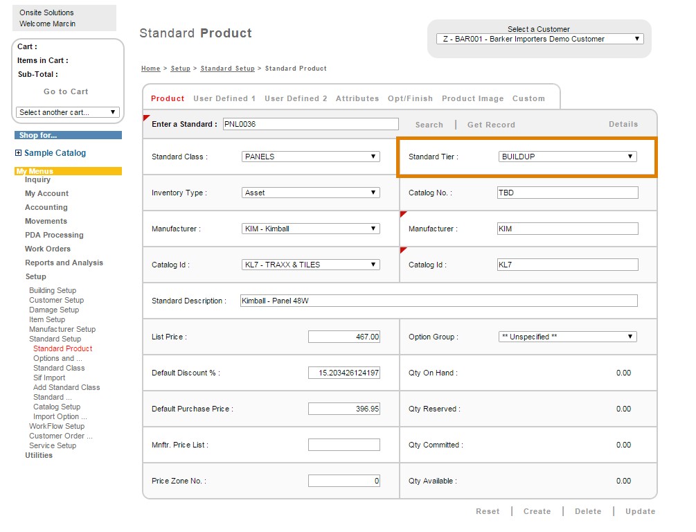 Standard Products screen display. Here is where you can set up a Buildup-tier Standard.