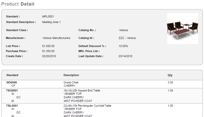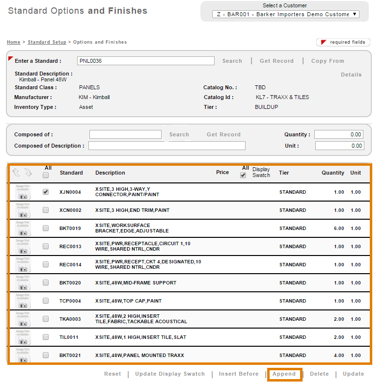 After the Buildup Standard is created, we can proceed to assign Standards to the Buildup. This is done on the Standard Options and Finishes screen. Just as you can use this screen to assign Options and Finishes composition to a single-item Standard, you can also use this screen to assign single-item Standards to a Buildup.