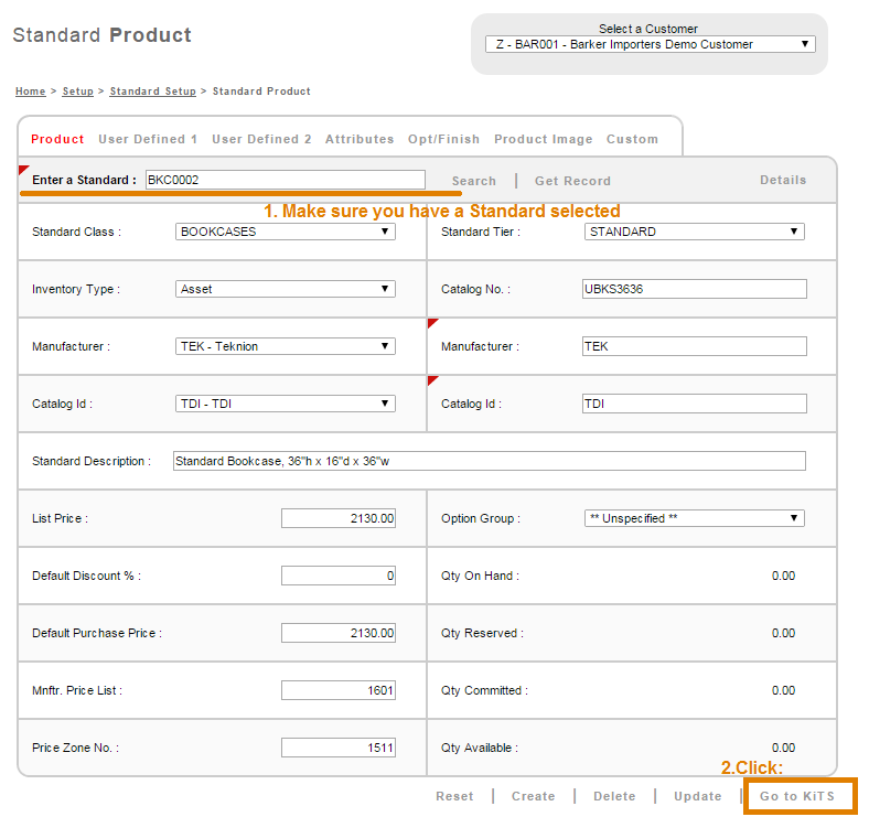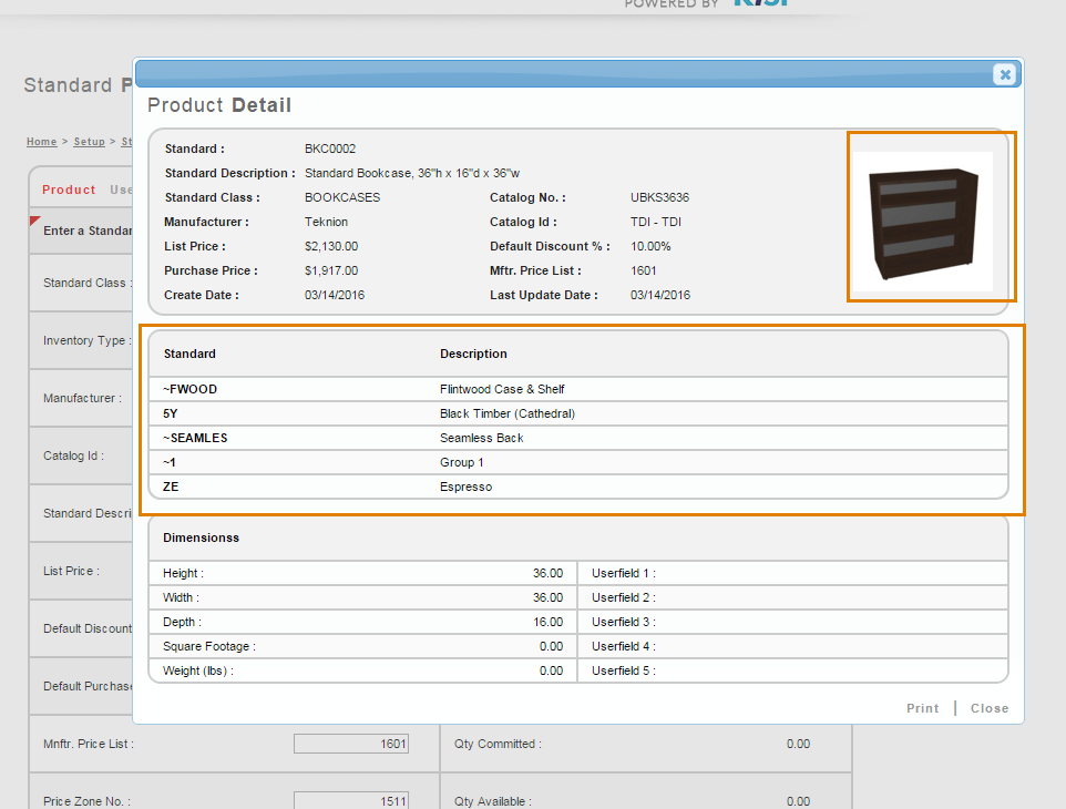 To see the changes within the Standard Product screen, select the Standard, click Get Record and Detail, the Product Detail page displays. Here you can see the specified Standard, with a rendered image and specified options and finishes from KiTS.