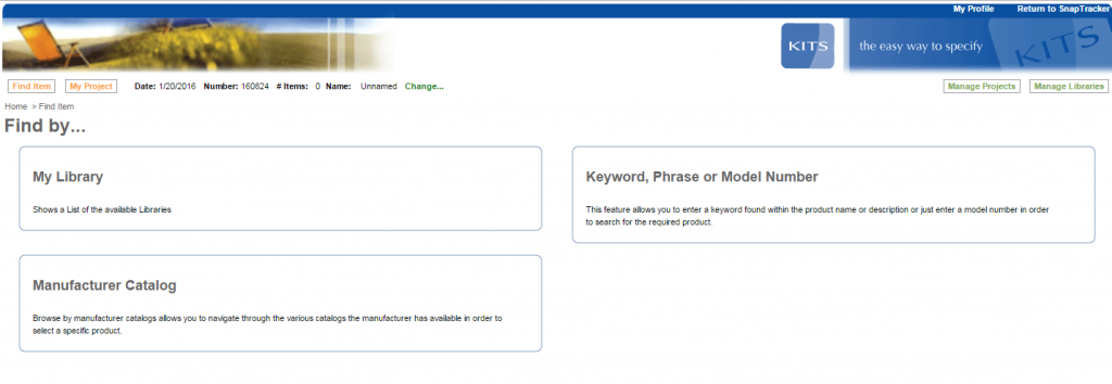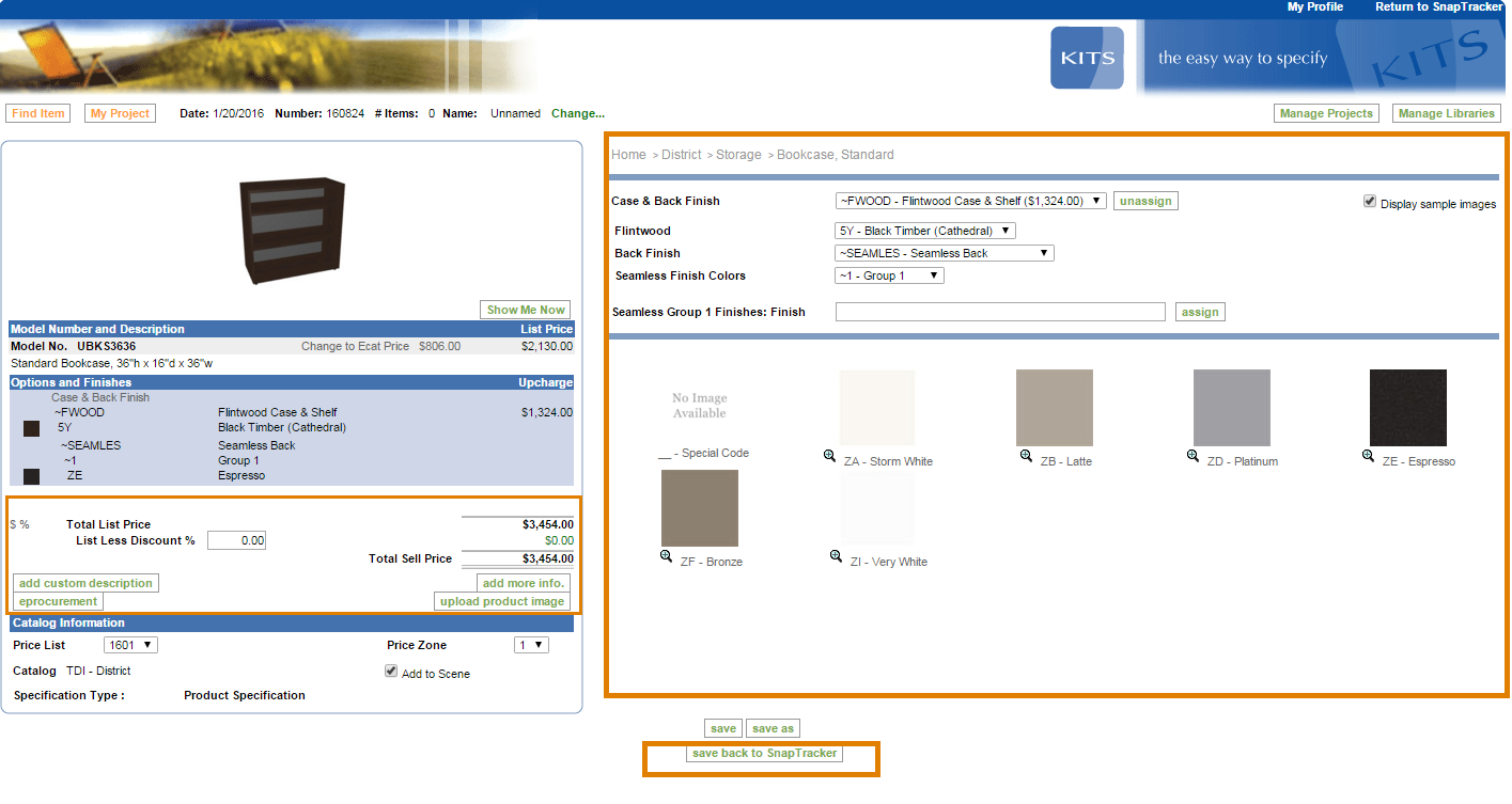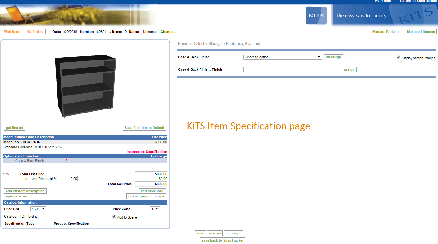 KiTS is a web-based furniture specification tool. You can use it to specify product and return the information (e.g. pricing, discounting, custom descriptions and images) to SnapTracker.