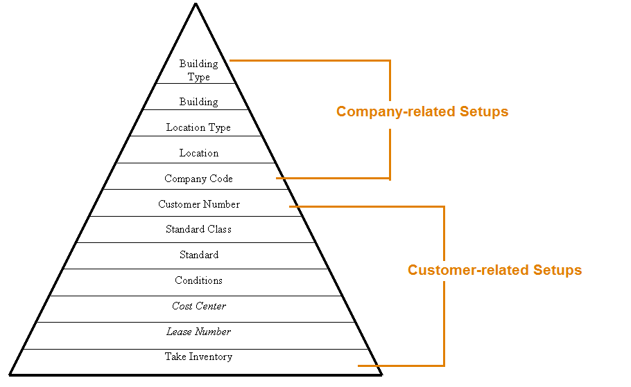 The second tier of the pyramid is tables that hold information specifically related to a customer. These tables (e.g. Standard, Conditions, and Cost Center) are customer-specific and linked a specific Customer Number, meaning that depending on each customer’s specific needs, you will need to set up these tables accordingly.